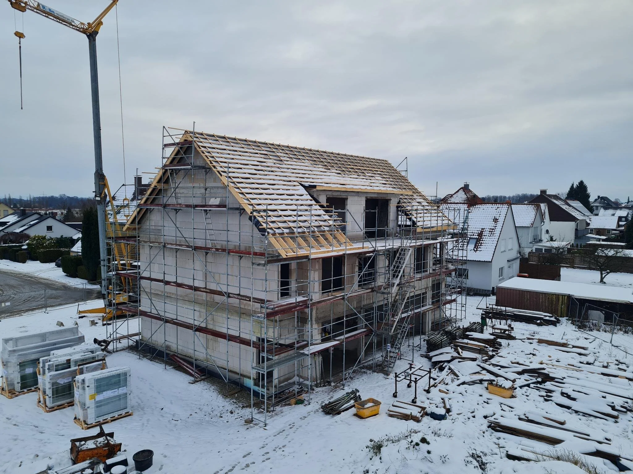Die erste Etappe an unserem Neubau in Helpup ist erreicht. Der Dachstuhl ist gerichtet, die Folien gezogen und die Lattung für die Ziegel angebracht - gerade noch rechtzeitig vor dem Wintereinbruch. Auch die meisten Fenster konnten wir schon einsetzen. Während nun draussen der Schnee die Vorherrschaft übernommen hat, können wir uns im Inneren dem Vorbereiten der Elektrik widmen. Sobald das Wetter es zulässt, wollen wir das Dach decken und somit das Haus von oben komplett dicht machen.